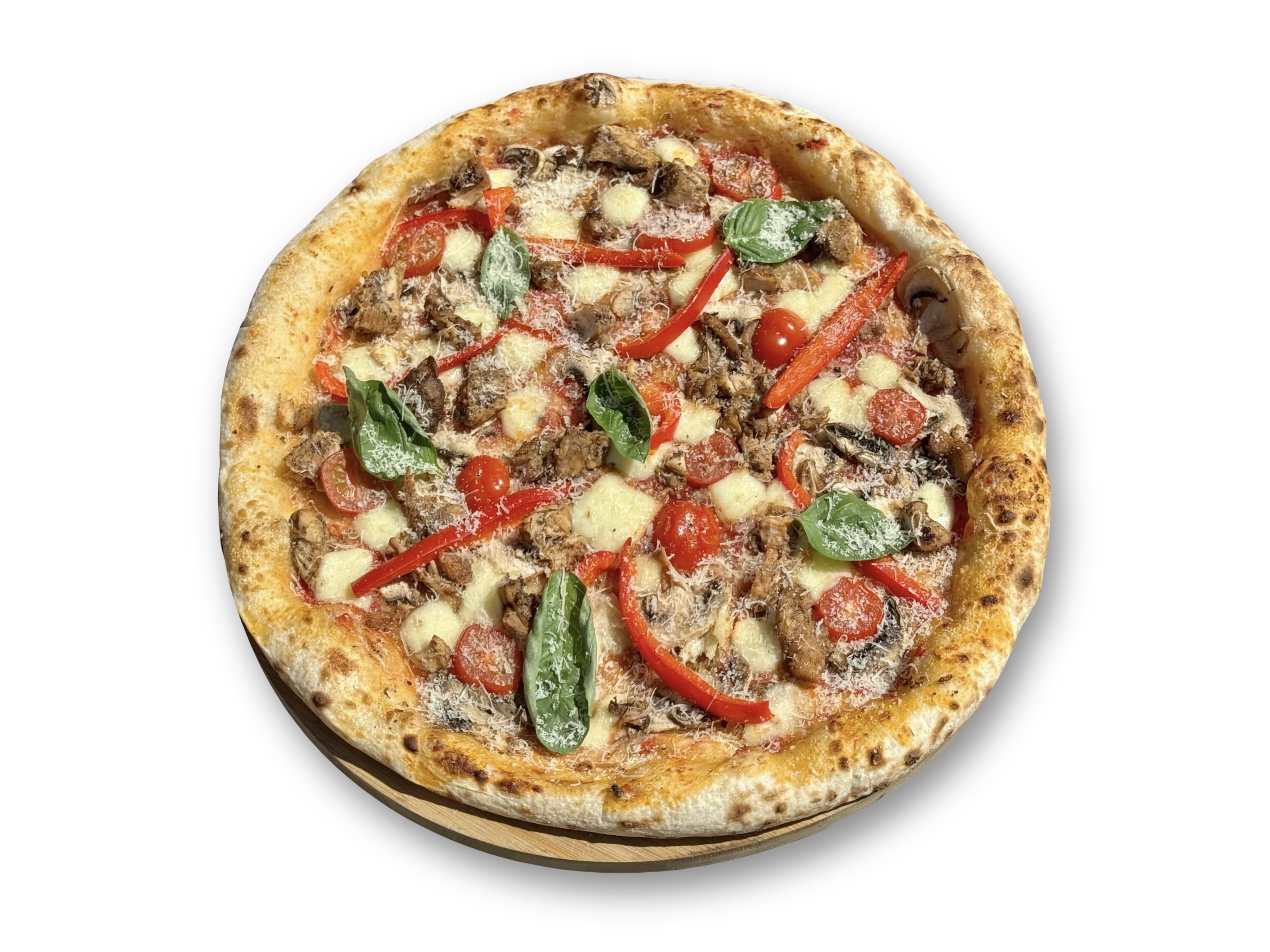 Ферментоване тісто 48 годин, червоний соус, моцарела, курка, шампіньйони, перец болгарський, помідори чері, пеюармезан, базилік